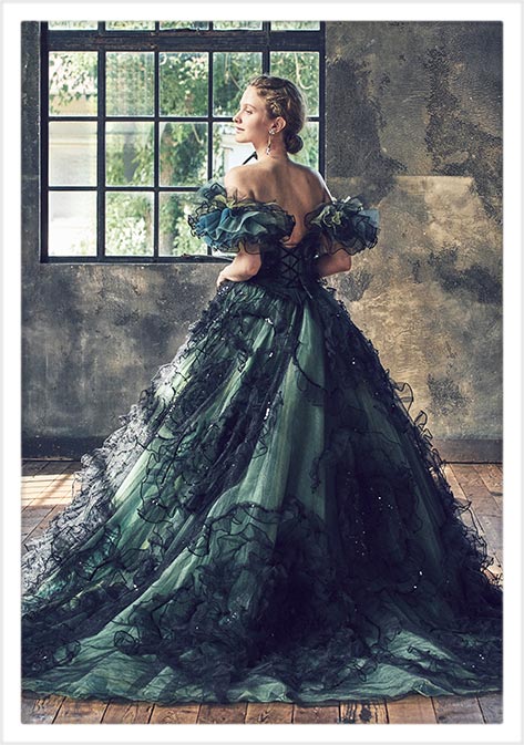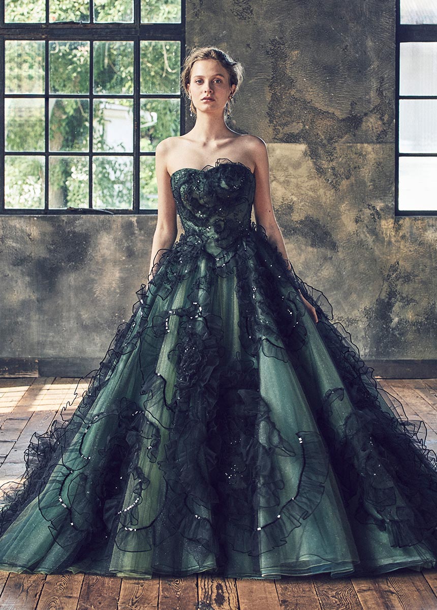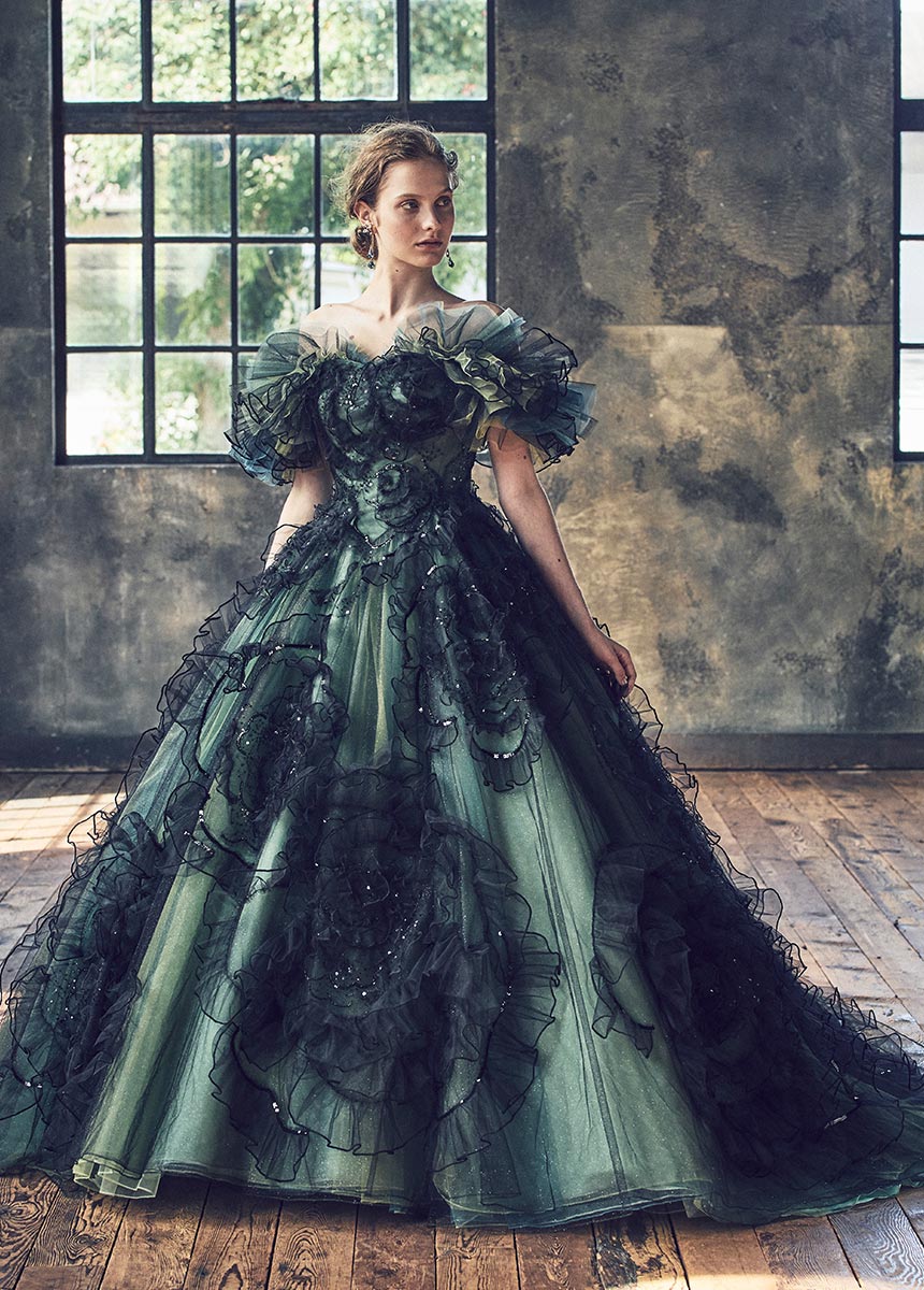 ユミカツラ大輪のバラシリーズ、黒のチュールフリルで大輪のバラを表現、ドレス全体にバラが咲き誇るドラマティックな1枚です。