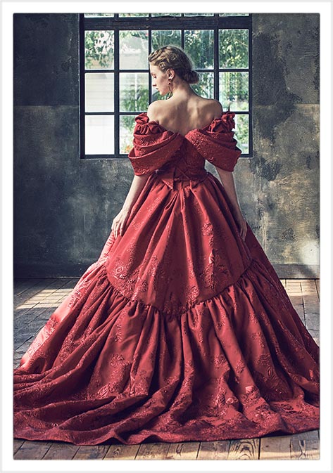 ジャガード生地の柄行きを活かし、たっぷりの分量感と柄の凹凸感がインパクトのある シンプルなカラードレス。大きなドレープスリーブは取り外し可能です。