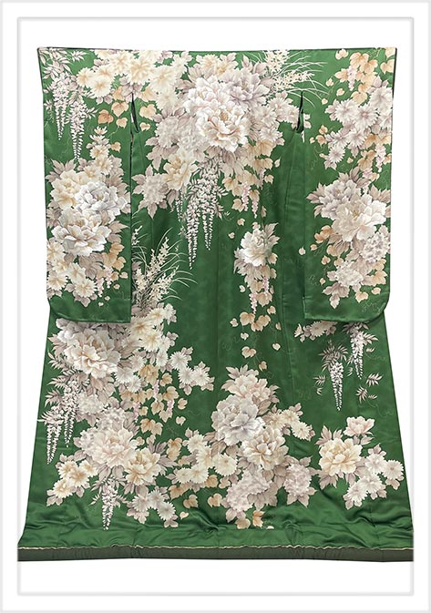 現在の主流であるフォトウエディングや小規模披露宴に対応したフォトジェニックな打掛。手書き友禅を取り入れることで豪華さを残しつつ軽やかなグリーンの配色が美しい贅沢な逸品。