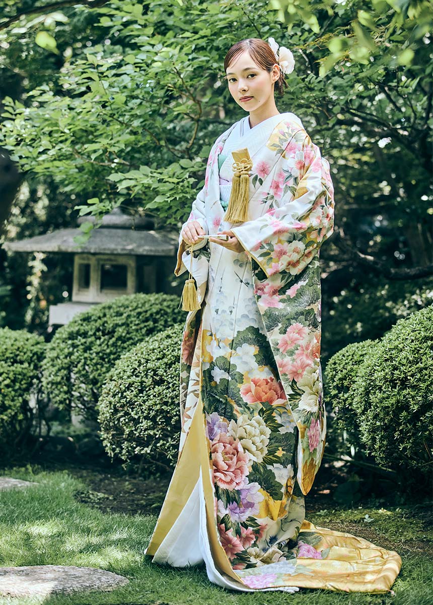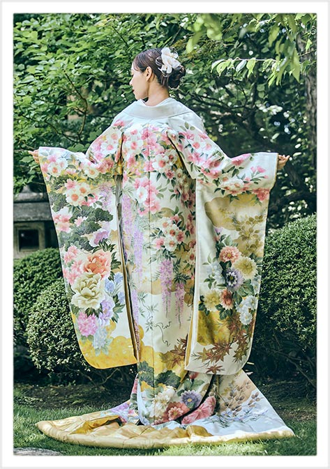 桂由美創作活動60周年の記念として制作した、四季の花々が見事に咲き誇る様子を手描き友禅と刺繍で表現した豪華な打掛。生地には綴織を使用した贅沢な逸品。