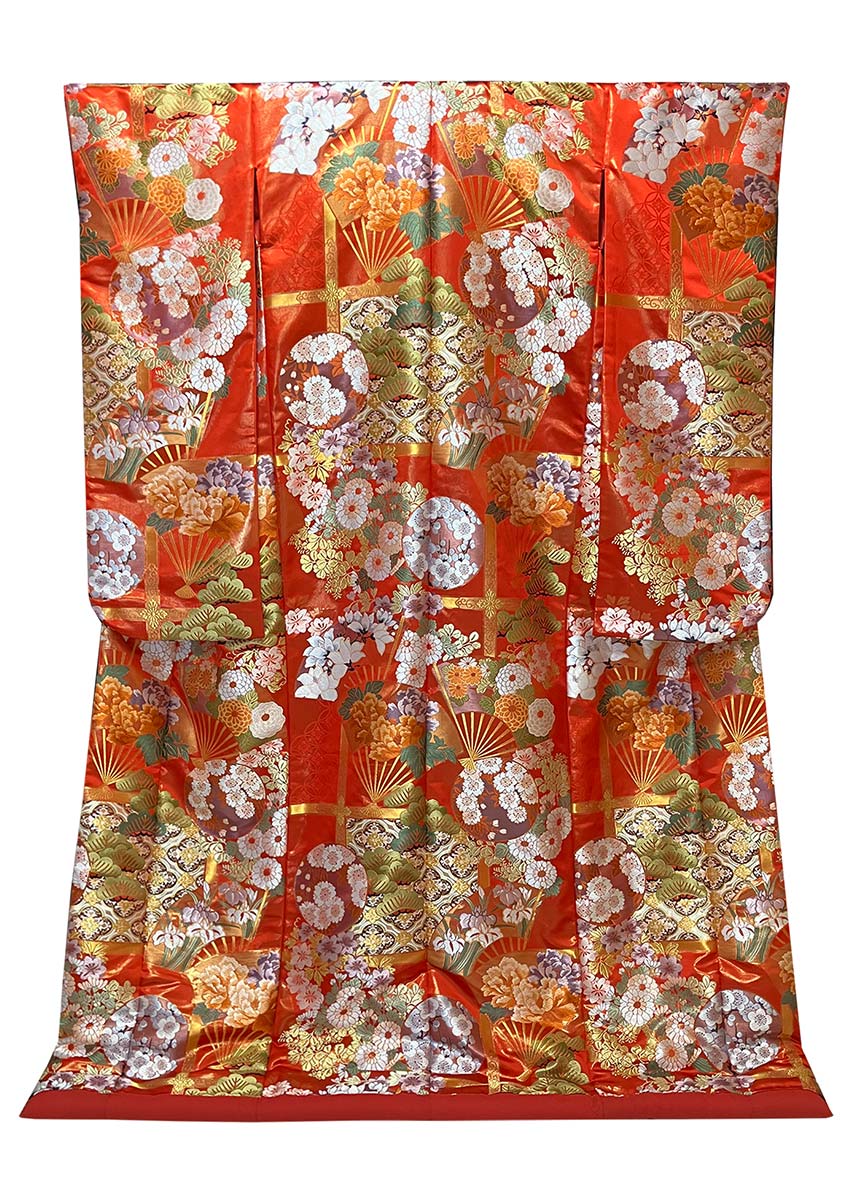 京都西陣で織り上げた、柔らかく美しい光沢が魅力の錦織の打掛。末広がりで縁起の良い扇や、神社仏閣に用いられる格式高い格天井の柄を、金糸をふんだんに用いて織り上げた美しい光沢が魅力の錦織の打掛。
