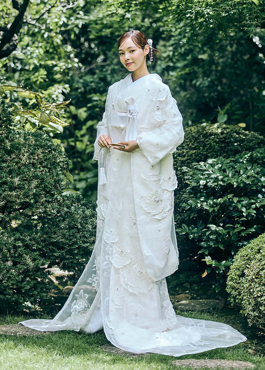 YUMI KATSURA 独自のオーガントレーン打掛。 取り外し式の異なる色のアンダーキモノを重ね、2WAYで楽しんでいただけるニューキモノスタイル。 白.ピンク.ブルーのカラーバリエーションからお選びいただけます。