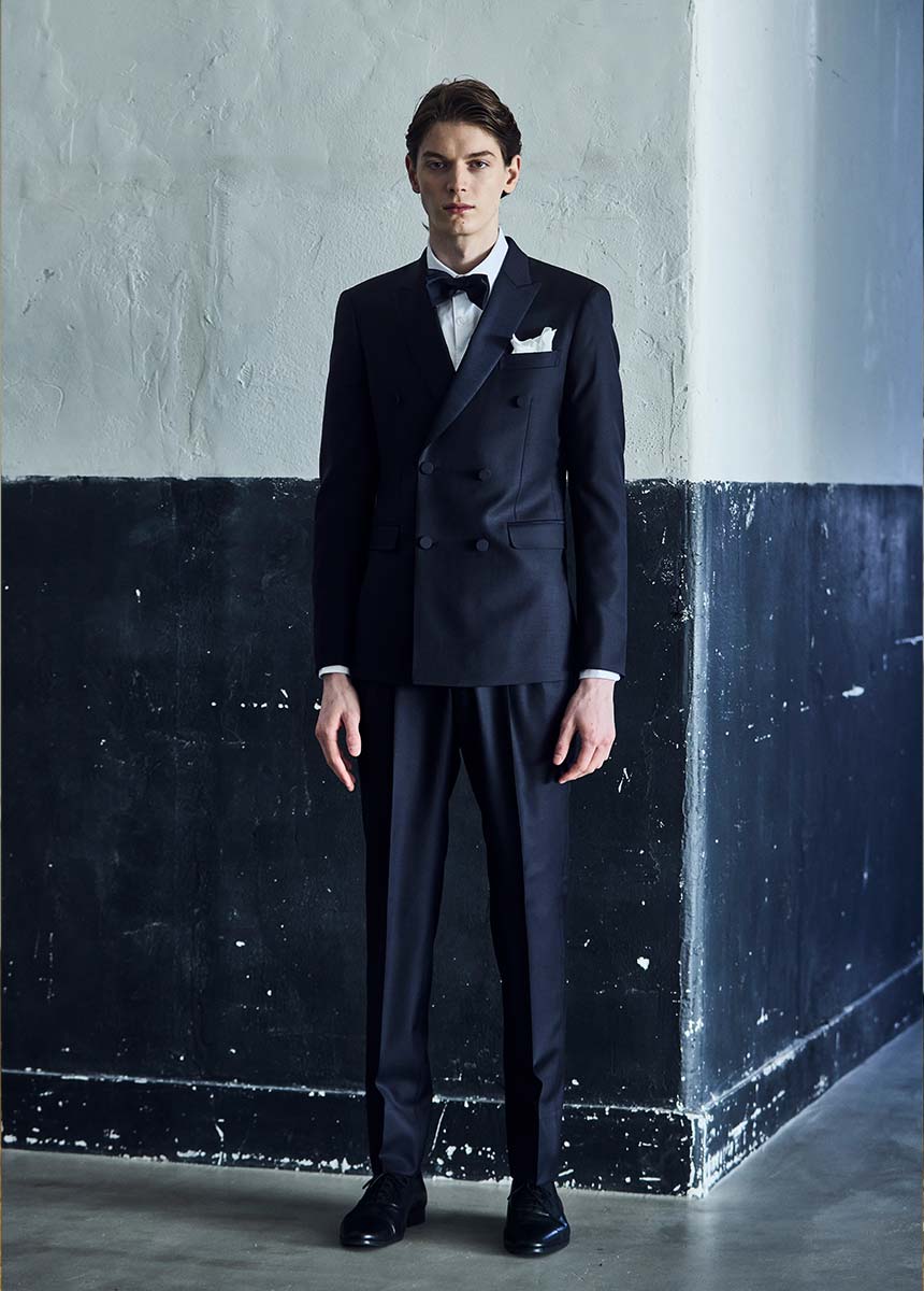 ラぺルにはグログランを施したエレガントな6つ釦のダブルブレストスーツです。 素材にはDORMEUILの「サスティナブルシリーズ」ミッドナイトブルーをセレクトしました。 ナチュラルフィットのツープリーツパンツとグログランネイビー蝶タイでのコーディネートです。