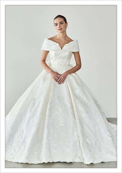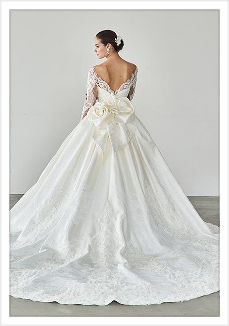 レースの上りを表現した膨れジャガード地に立体感のあるレースモチーフを施した、シンプルながら存在感のあるユミカツラならではのゴージャスなウエディングドレス。ケープデザインとブラウスで印象も変化します。