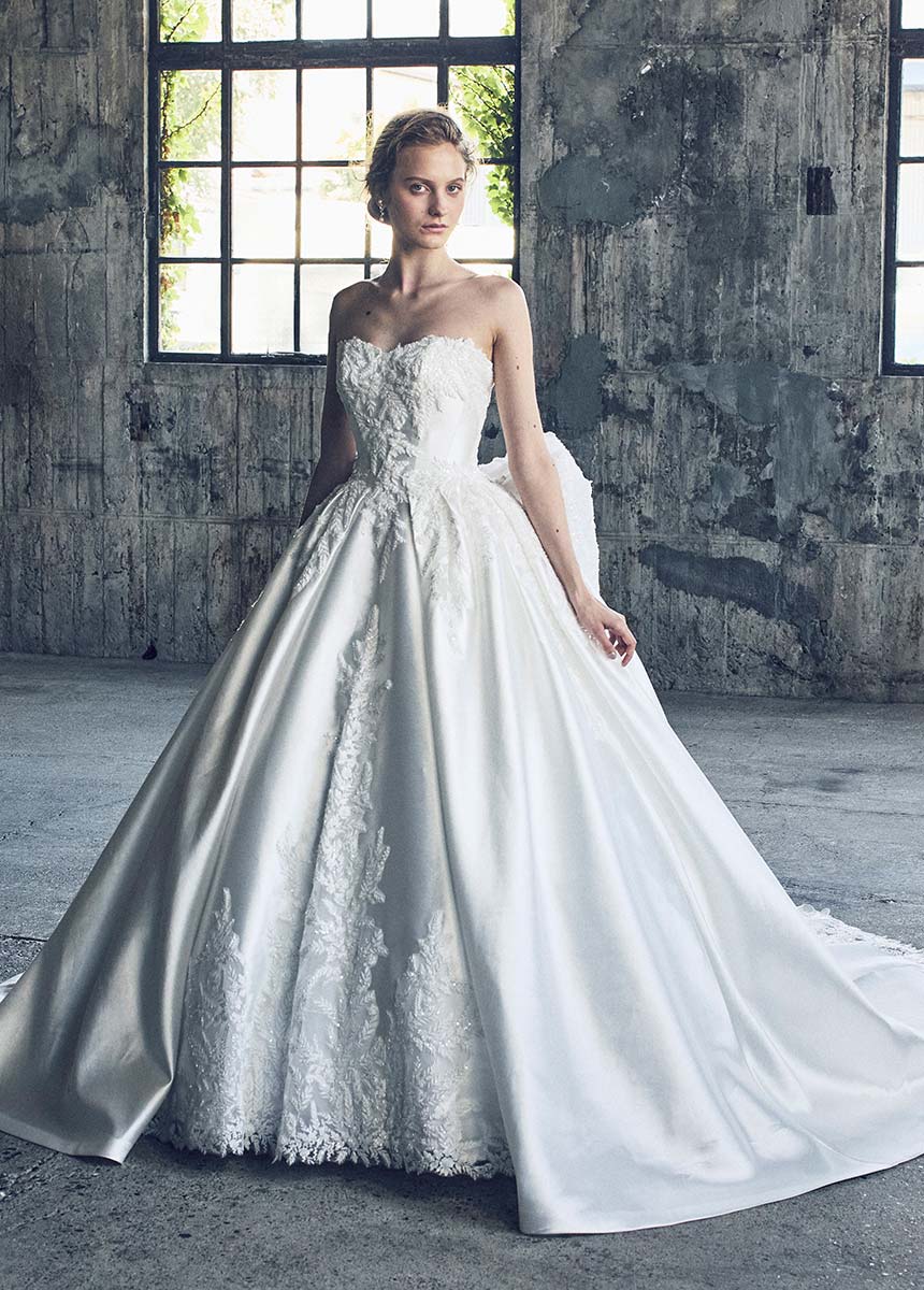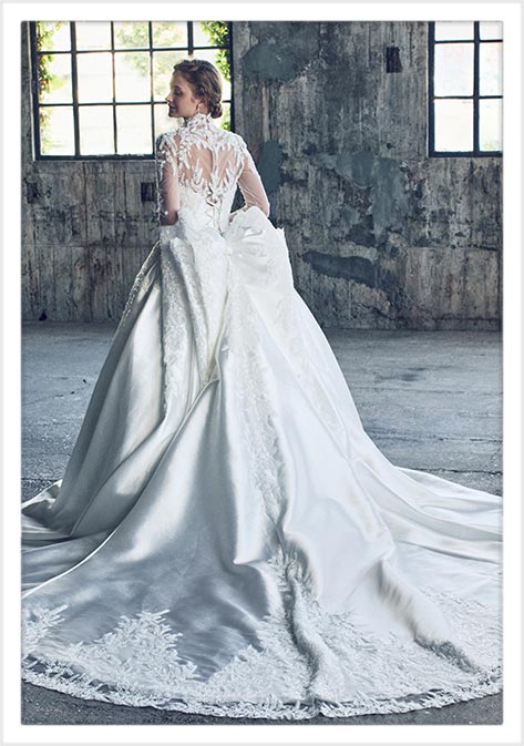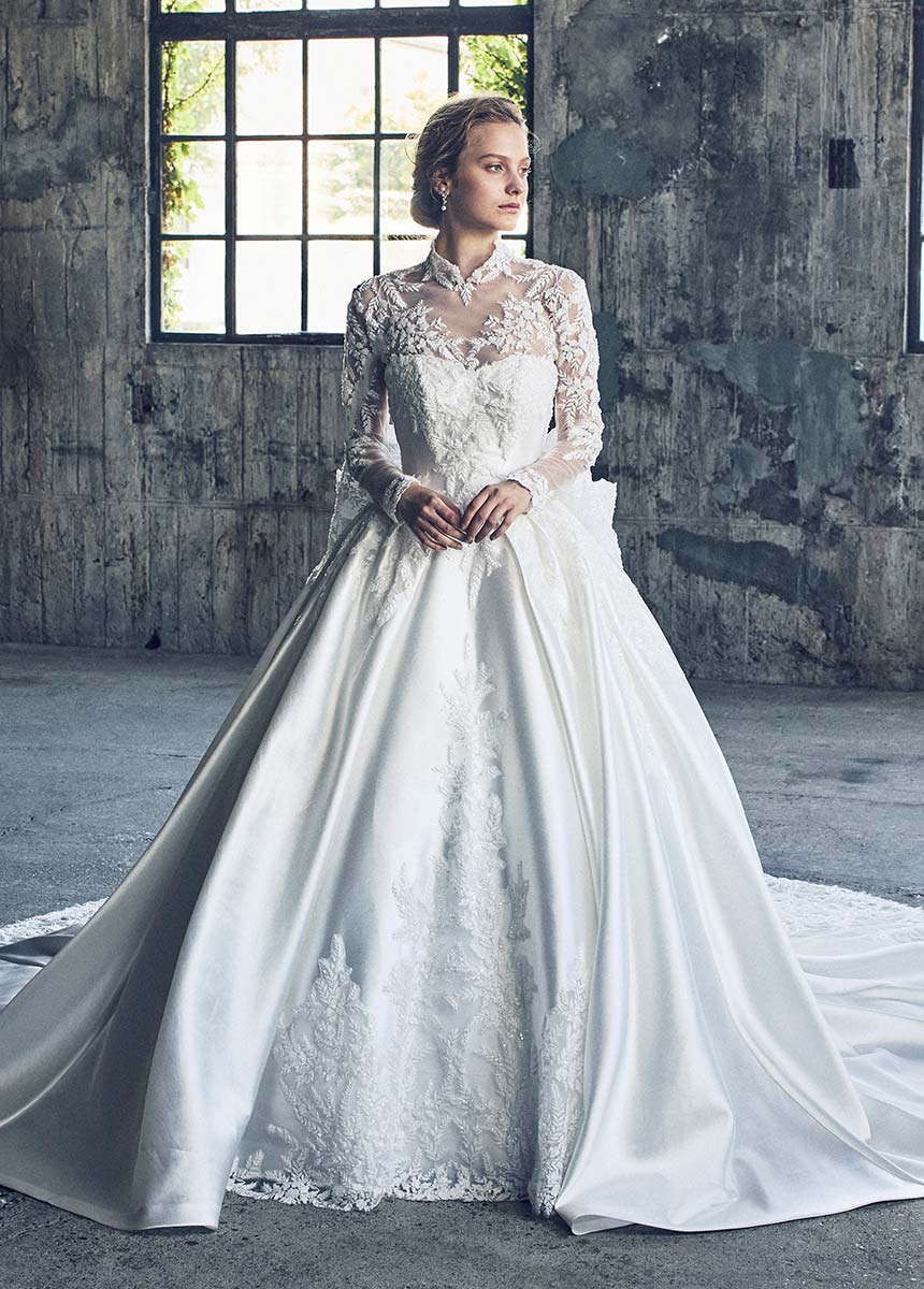 子孫繁栄のモチーフと言われる「麦の穂」をデザインした繊細なビーディングモチーフを シルクミックスミカドで配し、くり抜きのテクニックで柄を際立たせ、 バタフライシルエットのバックポイントが華やかな、ユミカツラならではの王道スタイルの ウエディングドレス。
